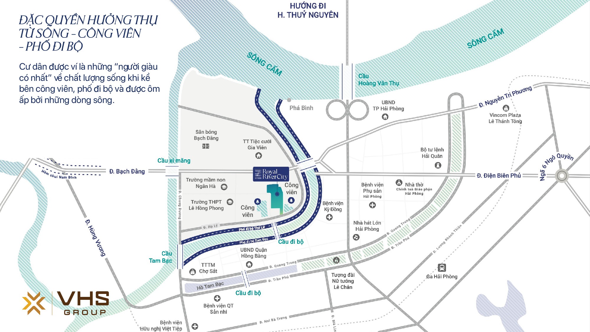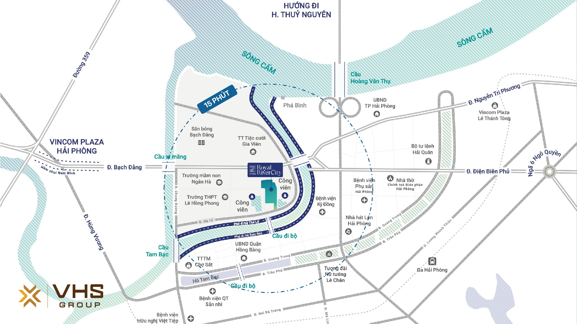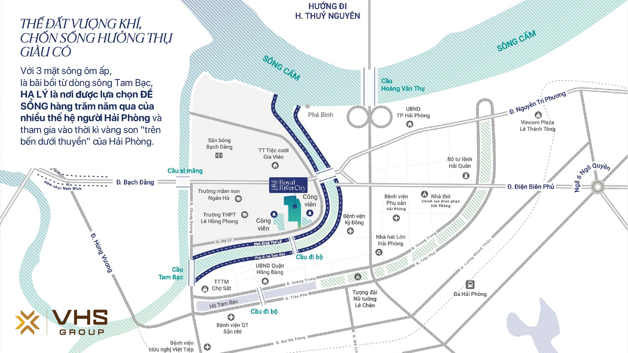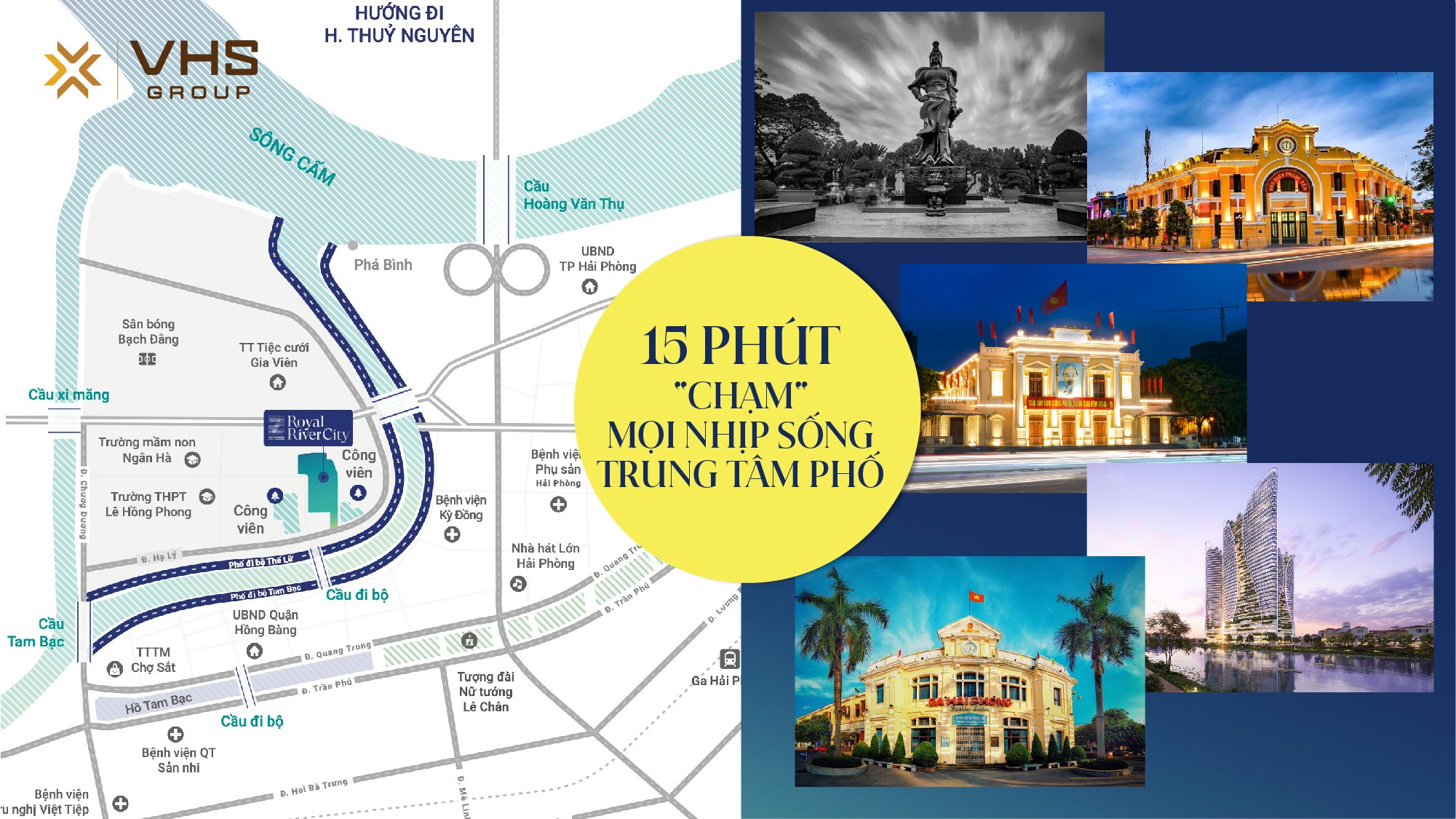Nằm ngay trung tâm Hồng Bàng – TP Hải Phòng, dự án Royal River City với vị trí đắc địa, tiếp giáp các mặt gần sông nên có thể coi đây là vị trí phong thủy , kết nối đi lại thuận lợi với các quận của Thành phố.